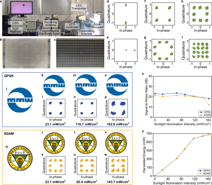 東南大學 Tie Jun Cui、Wei Xiang Jiang 團隊提出了一種太陽能供電的光調制微波可編程超表面 (SLMPM),它集成了一個光伏模塊,可以同時獲取調制光的信息和陽光的能量。這種 SLMPM 能夠在陽光直射下實現從光到微波領域的直接、實時和可靠的信息傳輸,并可以靈活地實施各種調制方案。它的低功耗和板載能量收集能力允許在 8 小時的單一陽光能量輸入下進行 24 小時的光到微波信息傳輸。作者展示了一種用于實時圖像傳輸的混合無線通信系統,以體現 SLMPM 的突出特點。作者相信 SLMPM 可以為未來無線通信的可持續(xù)發(fā)展做出貢獻,使其更具成本效益、節(jié)能、環(huán)保和無處不在。