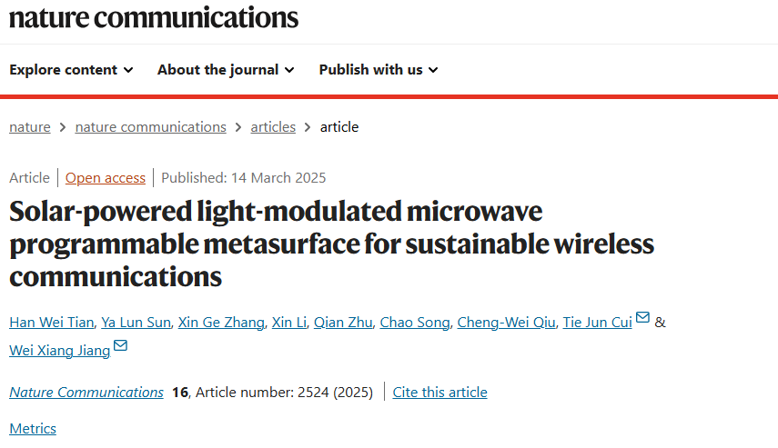研究成果于 2025 年 3 月 14 日以題為“Solar-powered light-modulated microwave programmable metasurface for sustainable wireless communications”發(fā)表在《Nature Communications》上。